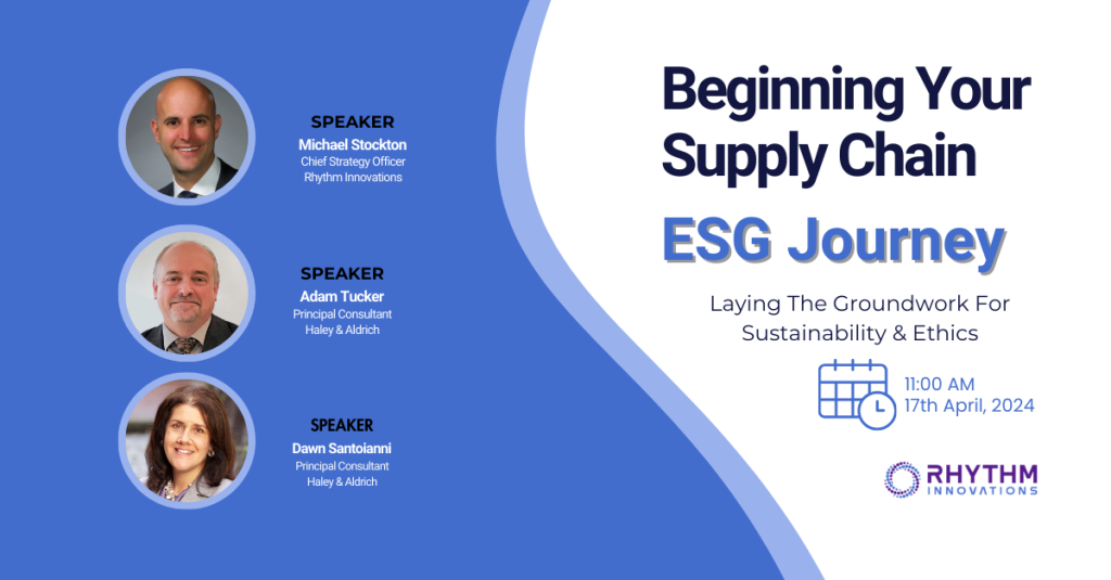 On April 17th, 2024, Rhythm Innovations hosted a webinar where industry experts discussed managing supply chain risk and ESG data challenges. The webinar was led by Michael Stockton, Chief Strategy Officer from Rhythm Innovations. Joining him from Haley & Aldrich were Adam Tucker, Principal Consultant, and Dawn Santoianni, Principal Consultant. The discussion provided valuable strategies for enabling supply chain engagement. For those unable to attend, here’s a recap of the key insights shared during the session. Watch the webinar recording here.
