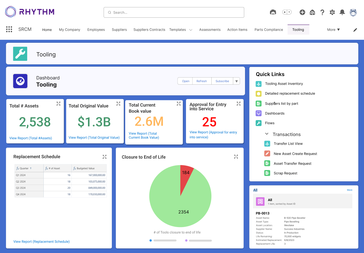Tooling plays a crucial role in manufacturing but managing it can be complex. Tooling is often custom-made, expensive, and located at supplier sites. This increases the risks of delays, unplanned costs, and compromised product quality. Without proper oversight, these challenges can negatively impact supply chain efficiency. To solve these issues, Rhythm Innovations has created ToolingIQ—a cloud-based solution designed to optimize the lifecycle of tooling assets across your supply chain.